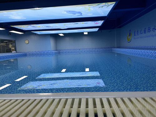 本項目位于河北省衡水市,為室內兒童游泳池,之前安裝的游泳池膠膜,因為施工問題導致漏水,找到我們進行整改,采用1.5mm游泳池膠膜進行整改,池壁進行刮膠粘接,接縫采用高溫工具進行熱熔拼接,從而形成一個整體的密封結構,整體效果如下: