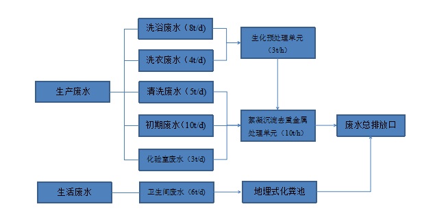 1)將洗浴洗衣廢水先進(jìn)行生化預(yù)處理,預(yù)處理后再與與綜合廢水(清洗、初期雨水、化驗(yàn)室等廢水)匯合,進(jìn)行去重金屬池。