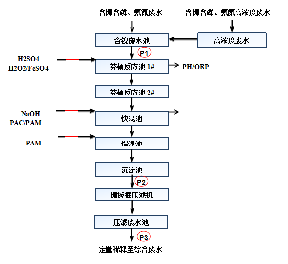 含鎳含磷、氨氮廢水通過提升泵提升至芬頓反應(yīng)池1#和芬頓反應(yīng)池2#,加入稀硫酸溶液、硫酸亞鐵與雙氧水,硫酸投加量由pH儀表自動(dòng)控制,在酸性條件下通過強(qiáng)氧化劑的氧化作用進(jìn)行氧化破絡(luò)與分解部分有機(jī)物;芬頓反應(yīng)后的廢水溢流入快混池和慢混池,在快混池中加入NaOH溶液和PAC溶液,NaOH投加量由pH儀表自動(dòng)控制,在慢混池中加入PAM溶液,經(jīng)助凝反應(yīng)后的含鎳廢水流入沉淀池進(jìn)行固液分離,沉淀池的污泥經(jīng)板框壓濾機(jī)壓濾,壓濾液獨(dú)立收集,定量稀釋到綜合廢水收集池進(jìn)行下一步反應(yīng)。